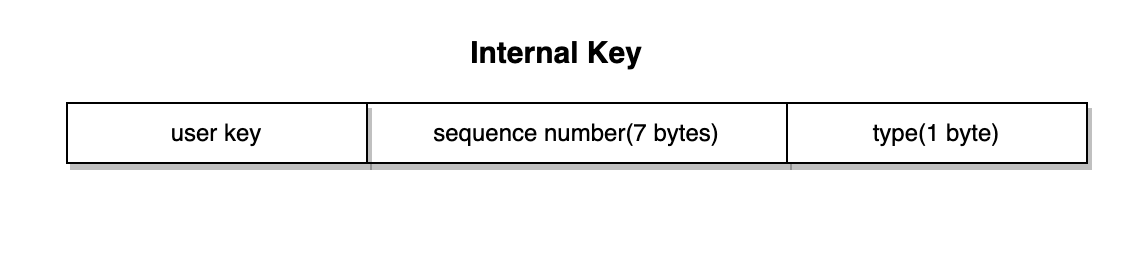 数据从Batch进入到MemDB后,其key就会被转换成internal key,其结构如下图。其实就是在原有的key后面加了8个字节的额外信息,包括7个字节的sequence number和1个字节的type(添加、删除)。sequence number是一个自增的ID,代表了数据的版本号,在本文中暂时用不到。