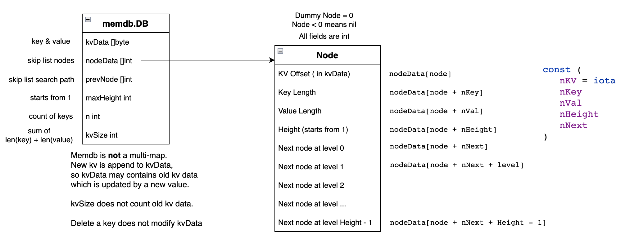nodeData[node + nKV]: kvOffset其数据在kvData的位置nodeData[node + nKey]: Key LengthnodeData[node + nVal]: Value LengthnodeData[node + nHeight]: Height 高度,从 1 开始计数nodeData[node + nNext + level]: 各层next指针,其值是下一个节点在nodeData中的offset,level范围是[0, Height - 1]