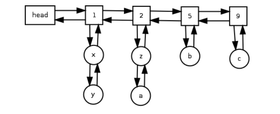 如图所示,将频率依次用双向链表连接,每个频率都有一个对应的LRU List与之关联。我们仍要维护两个map。map1存储key-node pair,node都要记录其对应的值以及频率;map2存frequency-node,此node要记录其对应的LRU List