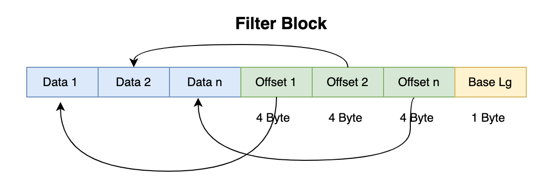 - MetaIndexBlock:存 Filter 的类型,及其在整个文件中的 offset