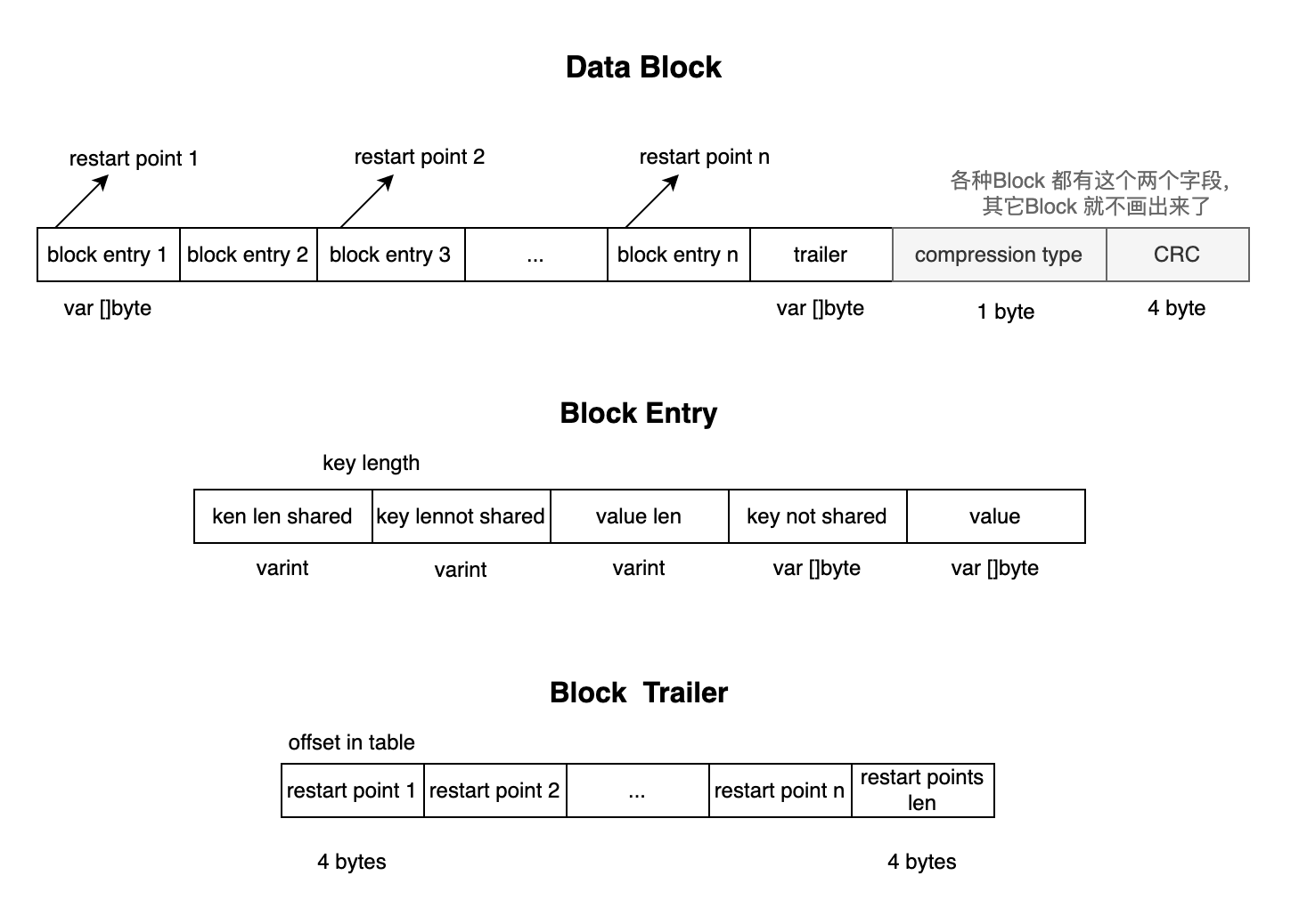 因此每个Block Entry 中用两个字段分别存储了 shared key和not shared key 两个部分的长度,然后只存储了not shared key 部分的key,前缀部分的key通过其对应的restart point以及shared key len可以读取到。