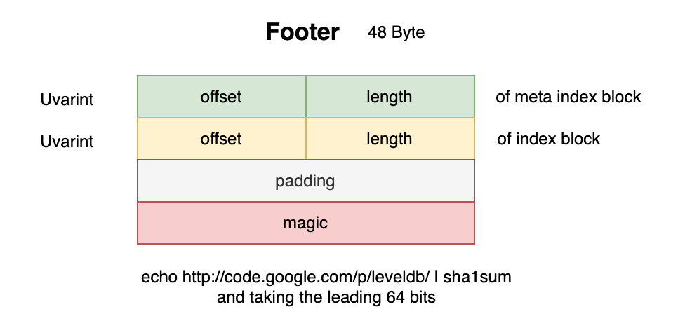 Footer 用来存储 MetaIndexBlock 和 IndexBlock 在文件中的 offset 和 大小。固定占 48 字节。最后一个字段是 Magic 字段。